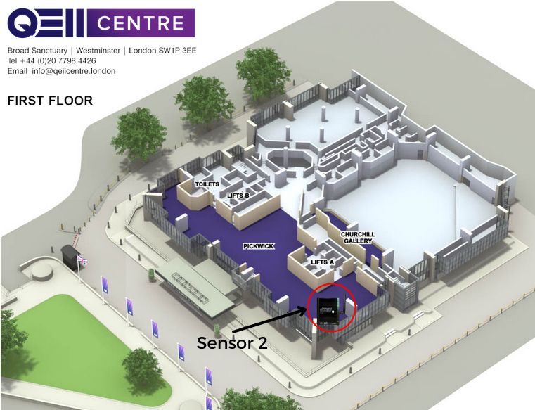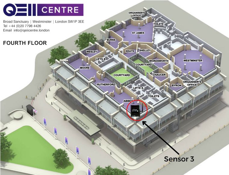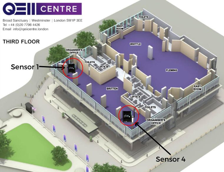 Sensor 3’s air quality can be found to be between 7 µg/m³ and 4 µg/m³ which is pretty standard for the kind of room. The largest peak seen on this data graph only reaches 15 µg/m³ as people turn up for the start of day 2.